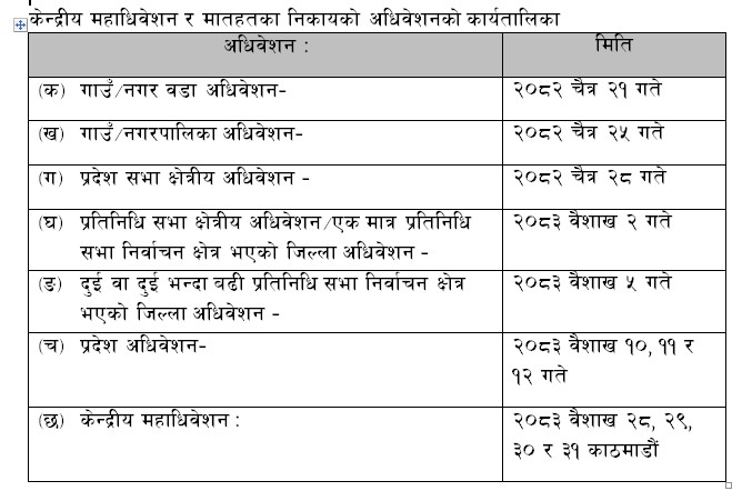 यसैगरी केन्द्रीय महाधिवेशन र मातहतका निकायहरूको अधिवेशन कार्यतालिकाअनुसार गाउँ-नगर वडा अधिवेशन २०८२ चैत २१ गते, गाउँ-नगरपालिका अधिवेशन २०८२ चैत २५ गते र प्रदेश सभा क्षेत्रीय अधिवेशन २०८२ चैत २८ गते हुने भएको छ । प्रतिनिधि सभा क्षेत्रीय अधिवेशन तथा एक मात्र प्रतिनिधि सभा निर्वाचन क्षेत्र भएको जिल्लाको अधिवेशन २०८३ वैशाख २ गते र दुई वा दुईभन्दा बढी प्रतिनिधि सभा निर्वाचन क्षेत्र भएको जिल्लाको अधिवेशन २०८३ वैशाख ५ गते तोकिएको छ ।
