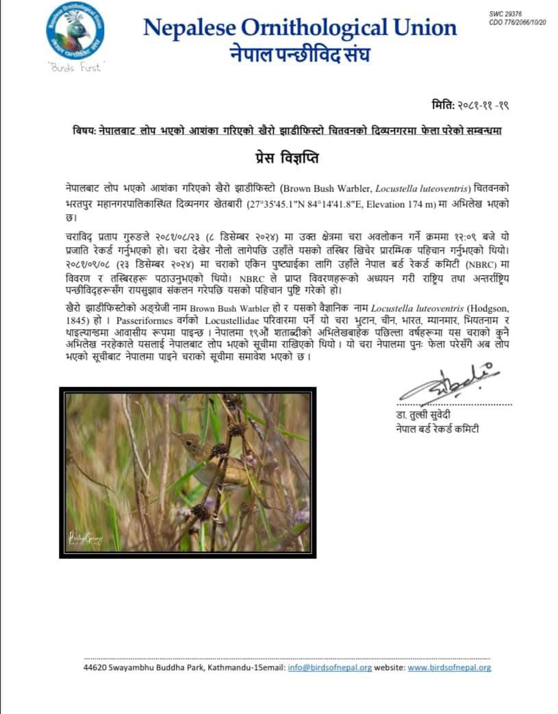 Ornithologist Gurung had taken a photo of the bird during the observation and made a preliminary identification. Gurung had sent the details and photos to the Nepal World Record Committee for the definitive confirmation of the newly seen bird. The Nepal Bird Record Committee has stated that the discovery of the Brown Bush warbler (Locustella luteoventris) was confirmed only after studying the details received and receiving the opinions and suggestions of national and international ornithologists.