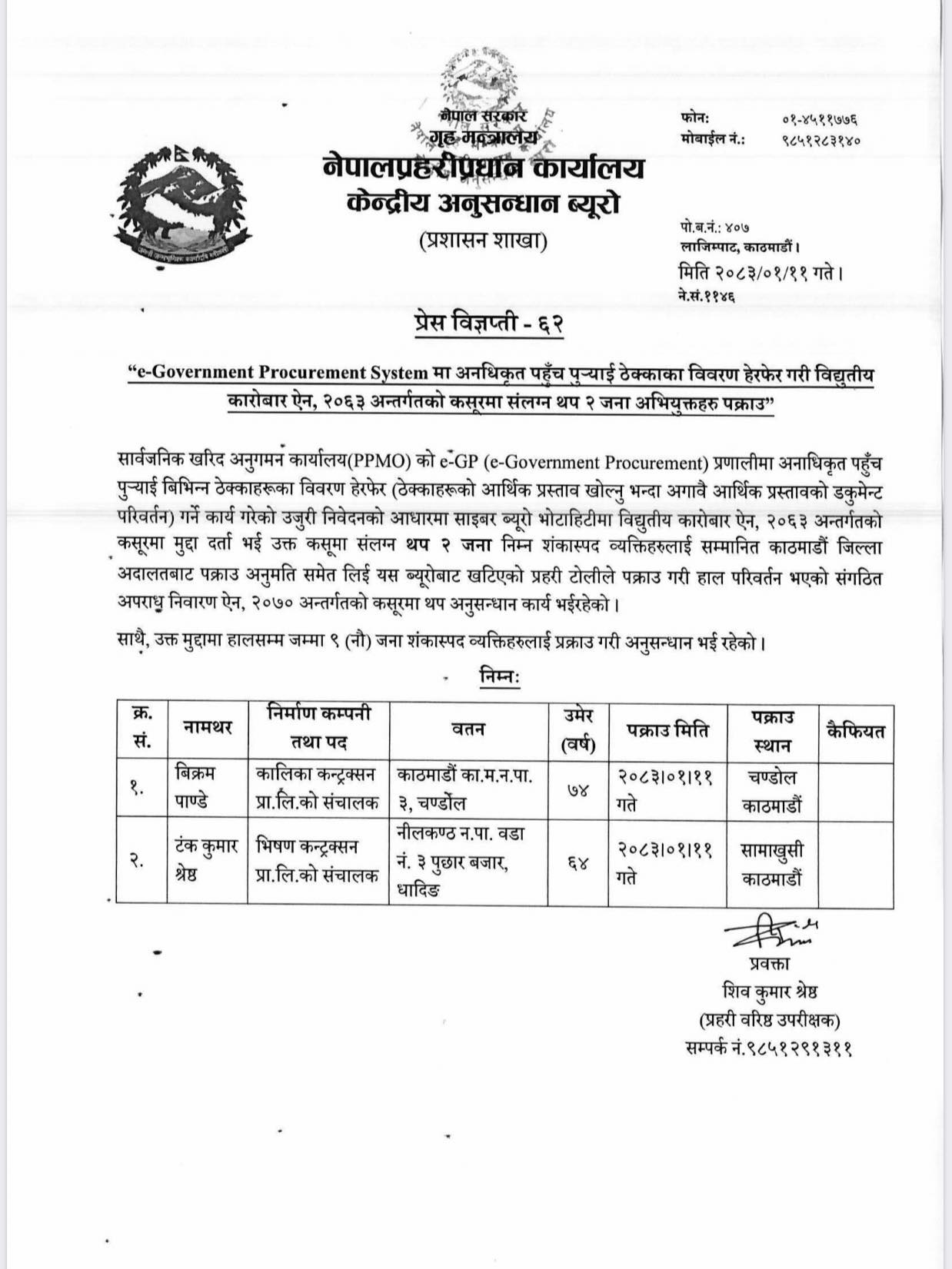 सीआईबीका प्रवक्ता एसएसपी शिवकुमार श्रेष्ठका अनुसार, यो गिरोहले योजनाबद्ध रूपमा सरकारी सफ्टवेयरको कमजोरी पत्ता लगाई ठेक्का हत्याउने काम गर्दै आएको थियो। यस प्रकरणमा हालसम्म ९ जना शङ्कास्पद व्यक्तिहरू पक्राउ परिसकेका छन्, जसमा प्राविधिक विशेषज्ञ र निर्माण व्यवसायीहरू समेत संलग्न रहेको बुझिएको छ।