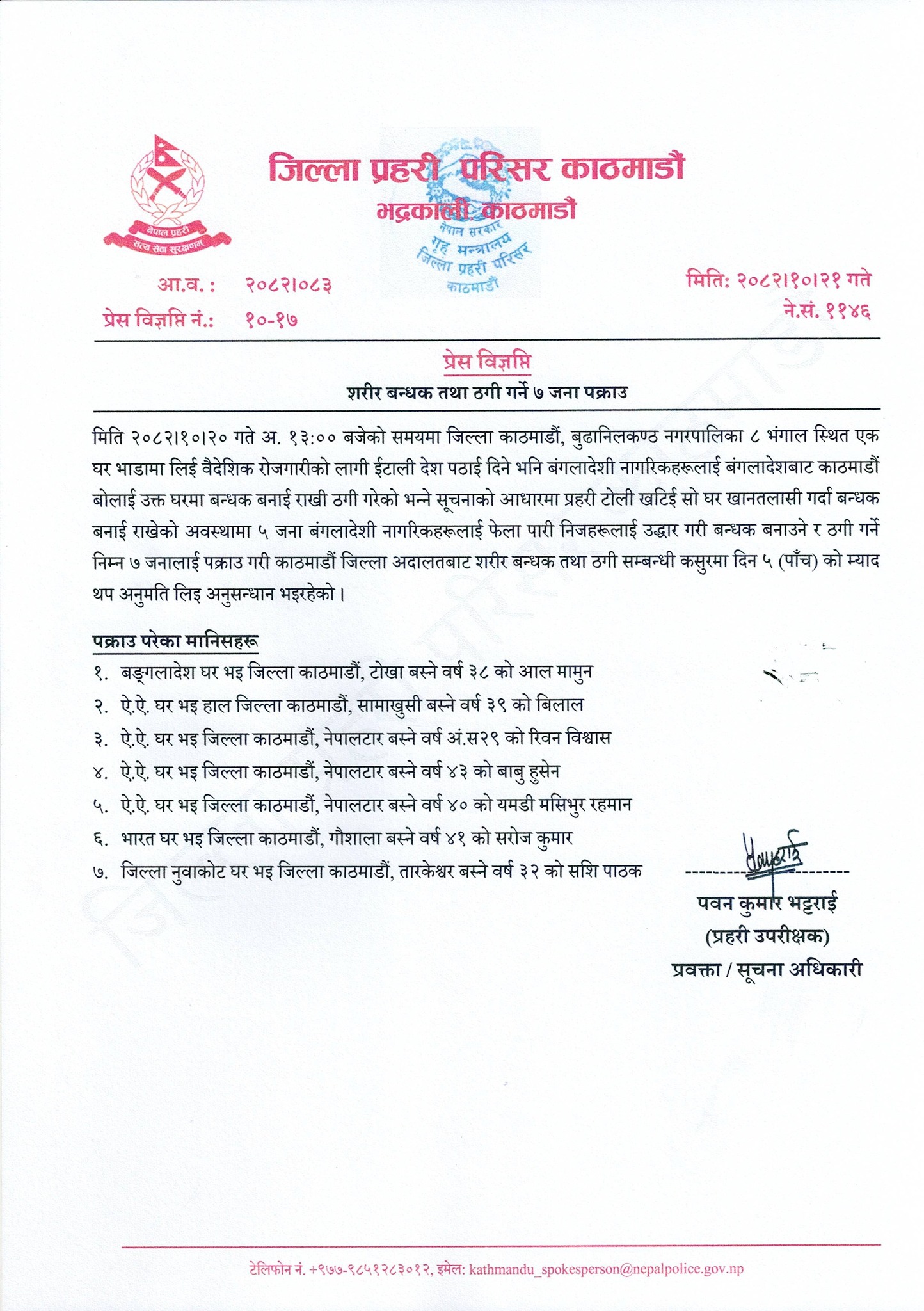 बुढानिलकण्ठ नगरपालिका वडा-८ स्थित घर भाडामा लिई ५ बंगलादेशी नागरिकहरलाई बन्धक बनाई राखेको अवस्थामा प्रहरीले उद्दार गरेको छ। वैदेशिक रोजगारीको लागि यूरोपियन मुलुक इटाली पठाइदिने भनि बंगलादेशी नागरिकहरलाई नेपाल बोलाई ठगि गरि बन्धक बनाई राखेको प्रहरीको अनुसन्धानबाट खुलेको छ। बंगलादेशी नागरिकहरलाई नेपाल बोलाई ठगि गरि बन्धक बनाउने कार्यमा संलग्न ७ जना पक्राउ गरेका मध्ये ५ जना बंगलादेशी नागरिक आलु मामुन,बिलाल, रिबन बिश्वास,बाबु हुस्सेन,यमडि मसोभुर रहमान र एक भारतीय सरोज कुमार सहित एक नेपाली साहसी पाठक रहेका छन्। प्रहरीले निजहरुलाई माघ २० गते करीब एक बजेको समयमा भाडाको घर मै पक्राउ गरि काठमाडौँ जिल्ला अदालतबाट ५ दिन म्याद थप गरि थप अनुसन्धान अगाढि बढाइरहेको छ।